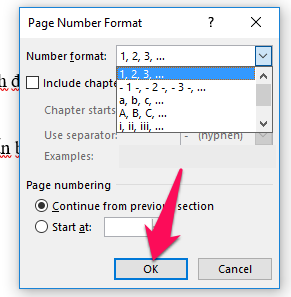 Chọn định dạng dùng để đánh số trang trong phần  Number format .
