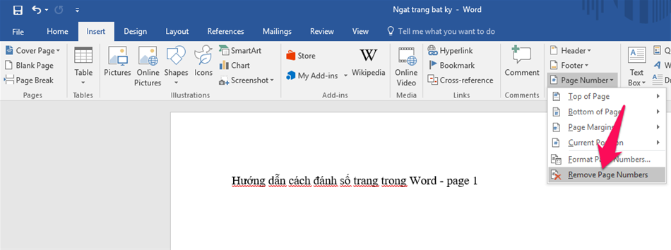 Để xóa đánh số trang, bạn nhấn nút  Remove Page Numbers  (vẫn trong phần Insert -> Page Number).