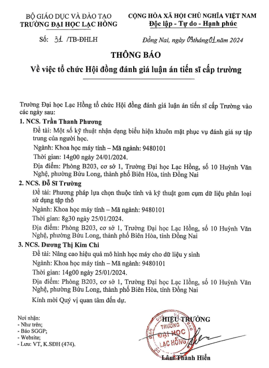 Thông báo Lịch bảo vệ luận án tiến sĩ cấp Trường ngành Khoa học máy tính tháng 01 năm 2024