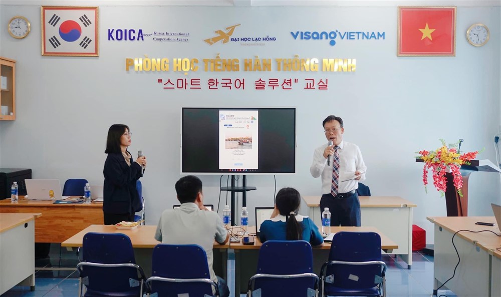 Ông Juong Hyon Kang, Giám đốc điều hành của Công ty ARASOLF và chị Trương Thị Trà Mi hướng dẫn các thao viết sách điện tử trên phần nềm Namo Author đến giảng viên Khoa Đông phương học