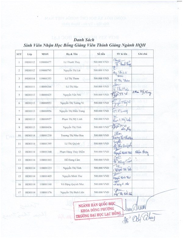 Danh sách sinh viên nhận học bổng: