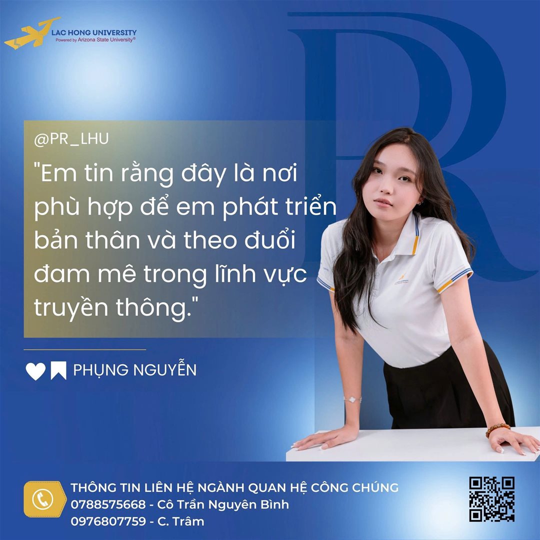 “Em chọn ngành Quan hệ công chúng vì em yêu thích giao tiếp, tổ chức sự kiện và mong muốn truyền tải thông điệp tích cực đến cộng đồng. Đại học Lạc Hồng có môi trường học năng động, giảng viên nhiệt tình và chương trình đào tạo thực tiễn. Em tin rằng đây là nơi phù hợp để em phát triển bản thân và theo đuổi đam mê trong lĩnh vực truyền thông.”