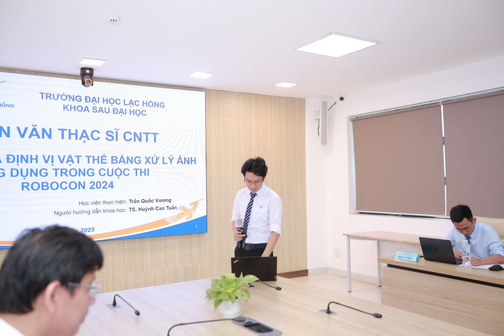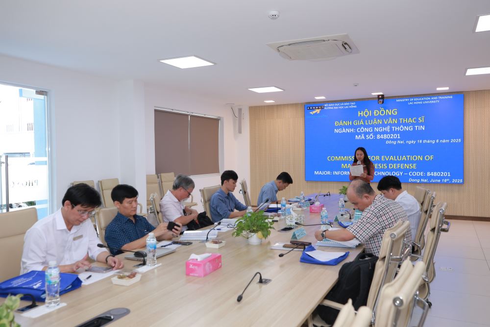 On June 16, 2025, at the meeting room of Campus 1 of Lac Hong University (LHU), four graduate students majoring in Information Technology successfully defended their master’s theses. The defense session was held in a formal and academic atmosphere, marking a significant milestone in the students’ academic and research journey.