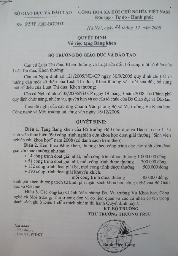 Quyết định tặng bằng khen giảng viên hướng dẫn SV đạt giải Nhất, Nhì GT "Tài năng khoa học trẻ Việt Nam" năm 2012