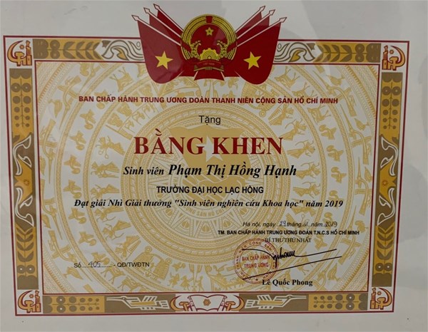 Hình 1: Bằng khen đạt giải nhì Giải thưởng sinh viên NCKH cấp Bộ năm 2019.